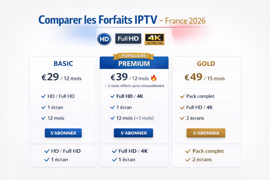 Forfait Gold (49€/mois) : Accès complet en Ultra 4K, 4 connexions simultanes, Coupe du Monde, Champions League en 4K, support prioritaire 24/7. Le meilleur rapport qualité-prix du marché.